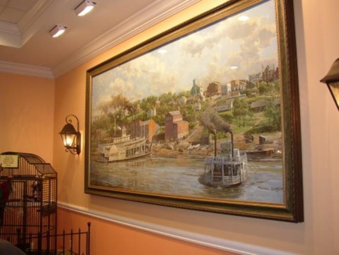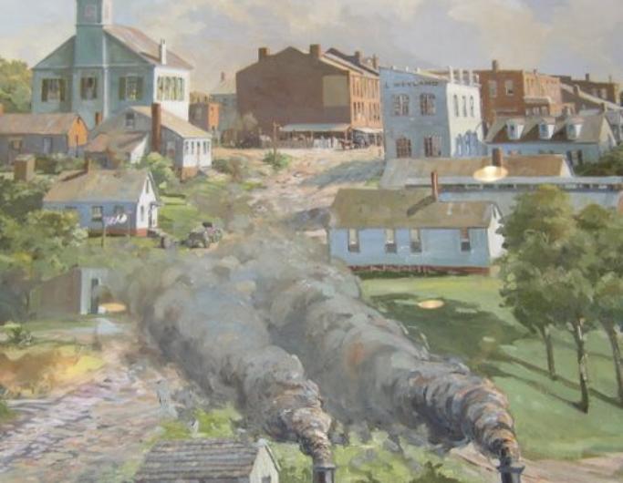 detailed painting on the wall, depicting Boonville in its heyday, in the late 1800's.