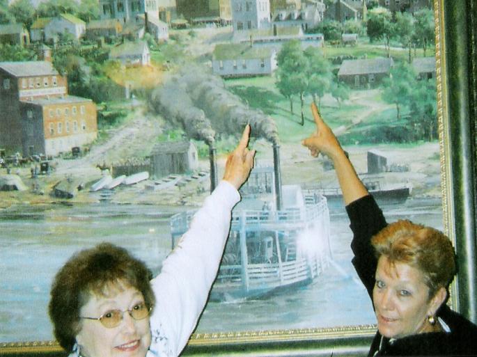 Nancy and Becky point to the Weyland wagon works and to the family home, next door