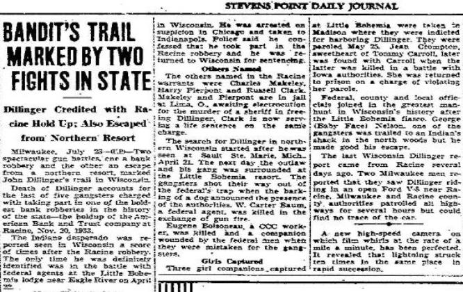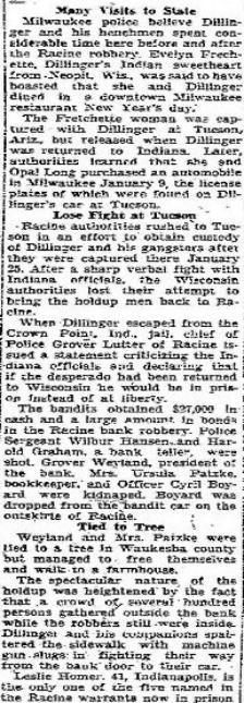 | Dillinger Credited for Racine Holdup; Also Escaped from Northern Resort Milwaukee, July 23 (1933) - Two spectacular gun battles, one a bank robbery and the other an escape from a northern resort, marked John Dillinger's trail in Wisconsin. Death of Dillinger accounts for the last of five gangsters charged with taking part in one of the boldest bank robberies in the history of the state - the holdup of the American Bank and Trust Company in Racine, Nov 20, 1933. The Indiana desperado was reported seen in Wisconsin a score of times after the Racine robbery. The only time he was definitely identified was in the battle with federal agents at the Little Bohemia lodge near Eagle river on April 22. Many Visits to State Milwaukee police believe Dillinger and his henchmen spent considerable time here before and after the Racine robbery. Evelyn Fretchette, Dillingers Indian sweetheart from Neopit, Wis was said to have boasted that she and Dillinger dined in a downtown Milwaukee restaurant New Years day. The Fretchette woman was captured with Dilliinger in Tucson, Ariz, but released when Dillinger was returned to Indiana. Later authorities learned that she and Opal Long purchased an automobile in Milwaukee January 9 the license plates of which were found on Dillinger's car in Tucson. Lose Fight at Tucson Racine authorities rushed to Tucson to obtain custody of Dillinger and his gangsters after they were captured there January 25. After a sharp verbal fight with Indiana officials, the Wisconsin authorities lost their attempt to bring the holdup men back to Racine. When Dillinger escaped from the Crown Point, Ind jail, chief of Police Grover Lutter issued a statement criticizing the Indiana officials and declaring that if the desperado had been returned to Wisconsin he would be in prison instead of at liberty. The bandits obtained $27,000 in cash and a large amount in bonds in the Racine robbery. Police sergeant Wilbur Hansen and Herold Graham, a bank teller, were shot. Grover Weyland, president of the bank, Mrs. Ursula Patzke, bookkeeper, and Officer Cyril Boyard were kidnapped. Boyard was dropped from the bandit car on the outskirts of Racine. Tied to Tree Weyland and Mrs Patzke were tied to a tree in Waukesha County but managed to free themselves and walk to a farmhouse. The spectacular nature of the holdup was heightened by the fact that a crowd of several hundred persons gathered outside of the bank while the robbers were still inside. Dillinger and his companions spattered the side walk with machine gun slugs in fighting their way from the bank door to their car. Leslie Homer. 41, Indianapolis, is the only one of the five named in the Racine warrants now in prison in Wisconsin. He was arrested on suspicion in Chicago and taken to Indianapolis. Police said he confessed that he took part in the robbery and he was returned to Wisconsin for sentencing. Others Named The others named in the Racine warrants were Charles Makeley, Harry Pierpoint, and Russell Clark. Makeley and Pierpoint are in prison in Lima awaiting electrocution in the shooting of a sheriff in freeing Dillinger. Clark is now serving a life sentence on the same charge. The search for Dillinger in northern Wisconsin started after he was seen on Sault Ste. Marie, Mich...Apr 21. The next day the outlaw and his gang was surrounded at the Little Bohemia resort. The gangsters shot their way out of the federals trap when the barking of a dog announced the presence of authorities. W. Carter Baum, a federal agent was killed in the exchange of gun fire. Eugene Boisoneau, a CCC worker, was killed and a companion wounded by the federal men when they were mistaken for the gangsters. Girls Captured Three girl companions captured at Little Bohemia were taken to Madison where they were indicted for harboring Dillinger. They were paroled on May 25. Jean Crompton, sweetheart of Tommy Carroll, later was found with Carroll when the latter was killed in a battle with Iowa authorities. She was returned to prison on a charge of violating her parole. Federal, county, and local officials joined in the greatest manhunt in Wisconsin's history after the little Bohemia fiasco. George (Baby Face) Nelson, one of the gangsters, was trailed to an Indian's shack in the north woods but he made good his escape. The last Wisconsin Dillinger report came from Racine several days ago. Two Milwaukee men reported that they saw Dillinger riding in an open Ford V-8 near Racine. Milwaukee and Racine county authorities patrolled all highways for several hours but could find no trace of the car. |
